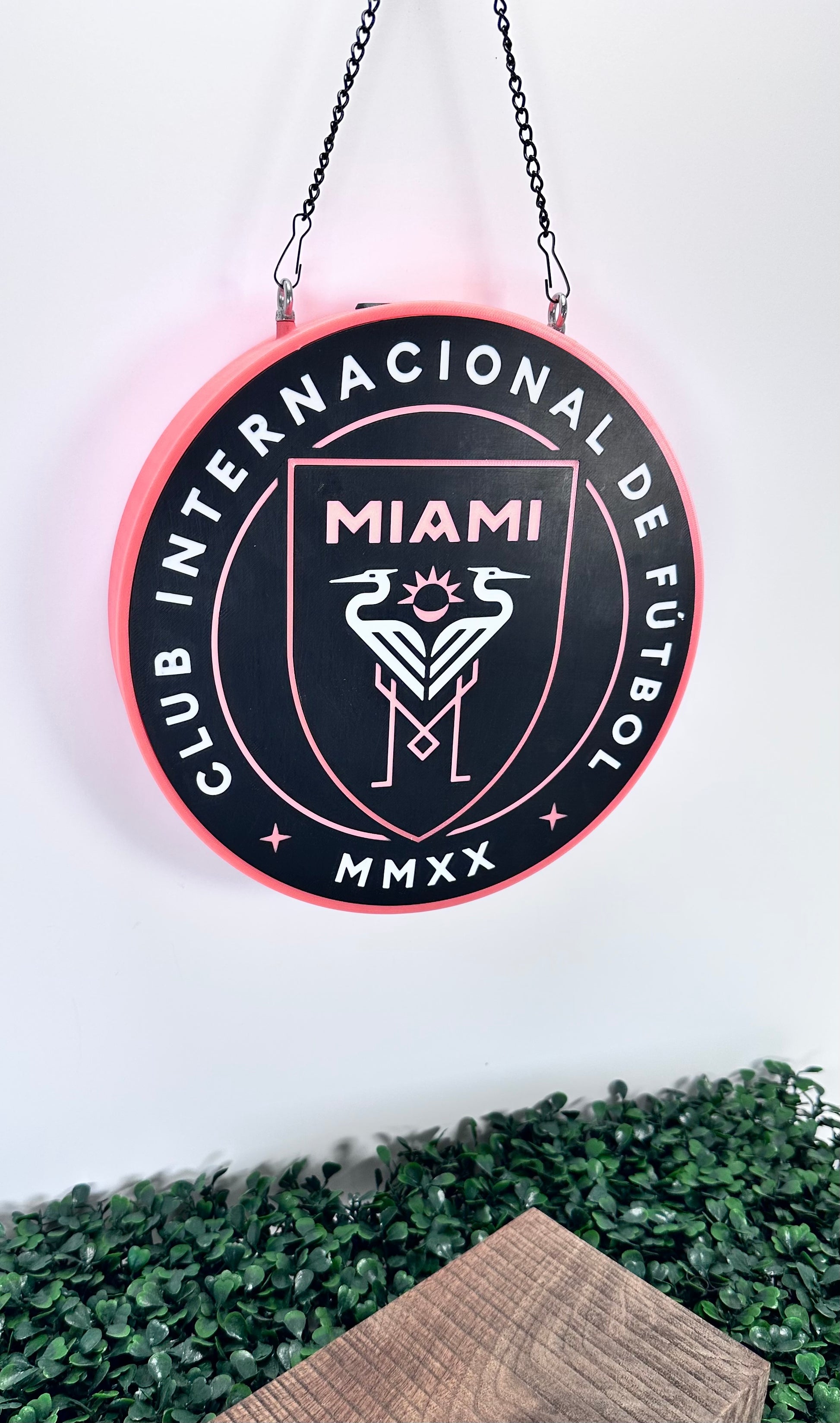 Bring Miami energy to your fan cave. This 3D-printed LED sign features a crisp Inter Miami–inspired crest, a pink perimeter that glows in the dark, and a smooth USB-C power hookup. Sized for easy placement and ships ready to hang—perfect for bars, gyms, game rooms, man caves, and she sheds.
