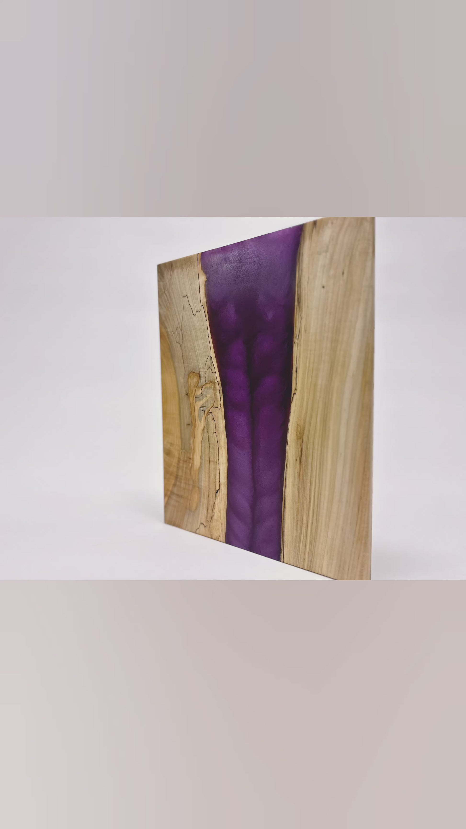 **Purple Resin Inlay Board**: This board features a deep purple resin inlay that brings a dramatic flair to the striking patterns of the maple ambrosia wood. The bold color contrasts beautifully with the natural hues and unique markings of the wood, making it not only a functional serving board but also a striking centerpiece.