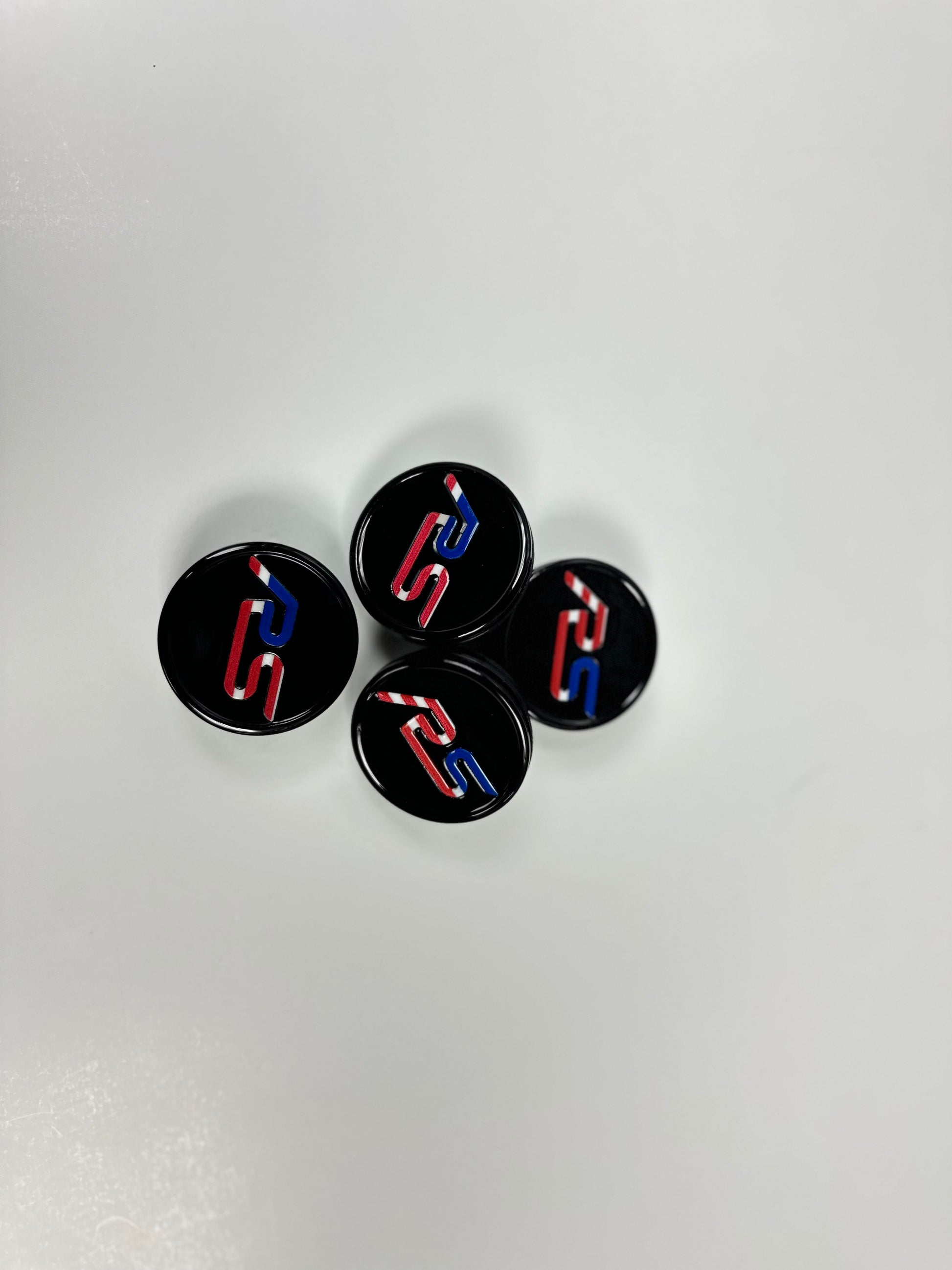 A: The caps come primed black and logo-ready. The logos in our photos are custom inserts for demo purposes. Contact us for custom logo options.